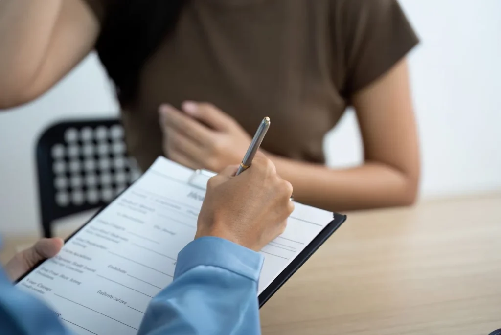 гинеколог уточняет жалобы, историю болезни и образ жизни.